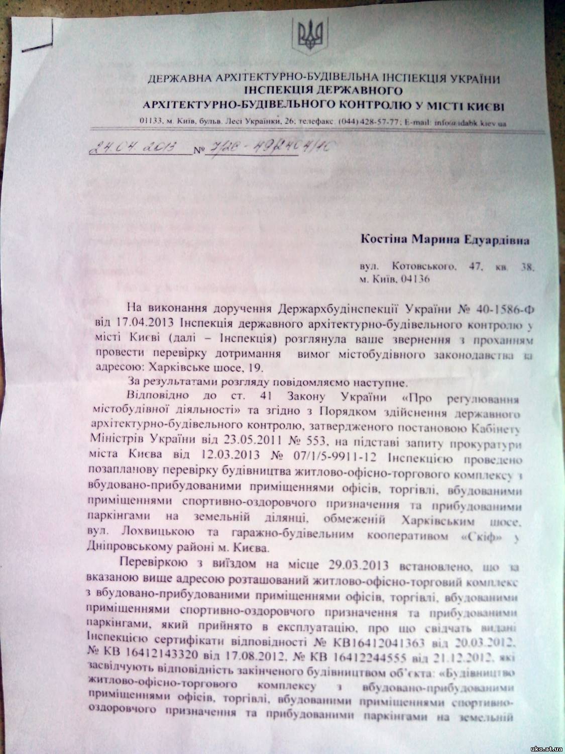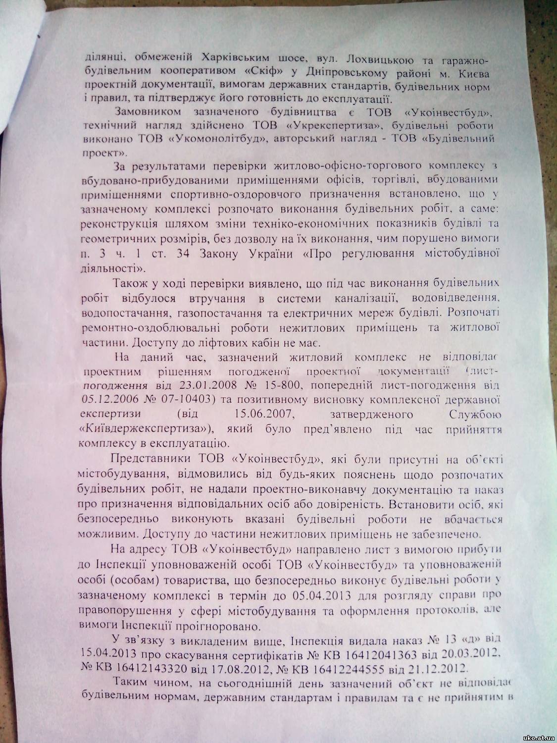 | BURNING, приходил вчера на 17.00 - никого так и не дождался. Тема правильная, сам с этой мыслью проснулся сегодня (про 100 уе). Теперь немножко другое направление, которое может быть тоже стоит проработать с юристами, если таковые у кого есть. На собраниях, когда на них присутствовал АП, он неоднократно повторял ответ на вопрос: "За чьи деньги вы строите ТЦ" - "За ваши". Следовательно, путем нецелевого использования наших средств он построил за наши деньги ТЦ, т.е. де-факто, ТЦ "НАШ". Исходя из информации по стоимости аренды, которой я владею, только одна Кишеня ему платит в районе 300 тысяч в месяц. Следовательно, если добавить туда остальных арендаторов, получится в районе миллиона (плюс-минус). Раз эти деньги он зарабатывает на наших деньгах - почему они не идут на стройку? Можете себе представить МИЛЛИОН в месяц на стройку? Как их у него забрать - это живые деньги, причем, снова же де-факто - наши деньги! Какие есть мысли на этот счет? К тому же, если ТЦ построен на наши деньги, мы вправе блокировать его работу с помощью специально обученных индивидуумов. Вспомнике недавний инцидент на Березняках, ту же Врадиевку - силовое противостояние тоже может принести результат, раз путем переговоров не удается сдвинуть все с мертвой точки.Добавлено (24.07.2013, 10:25) --------------------------------------------- Для размышлений: "По сообщению пресс-службы инспекции государственного архитектурно-строительного контроля Киева, ведомство запретило эксплуатацию недостроенного многоэтажного дома на углу проспекта Тычины и Днепровской набережной. Заказчик строительства - компания «Украинская инвестиционно-инжиниринговая компания» - и проектировщик - «Архитектурный союз» - получили от инспекторов предписание о запрете эксплуатации дома. А также штраф на 1 млн. грн. Проверка, проведенная на месте, показала, что строительство жилого дома в Днепровском районе еще не завершилось, но первые три этажа уже сдаются под офисные помещения, хотя соответствующих разрешительных документов у заказчика нет. Более того, выяснилось, что и само строительство ведется с нарушениями - согласно планам этажности, девятый и двадцать восьмой этажи должны быть техническими, а построены как жилые." А если нам к ним обратиться? Я имею ввиду - Инспекцию государственного архитектурно-строительного контроля?