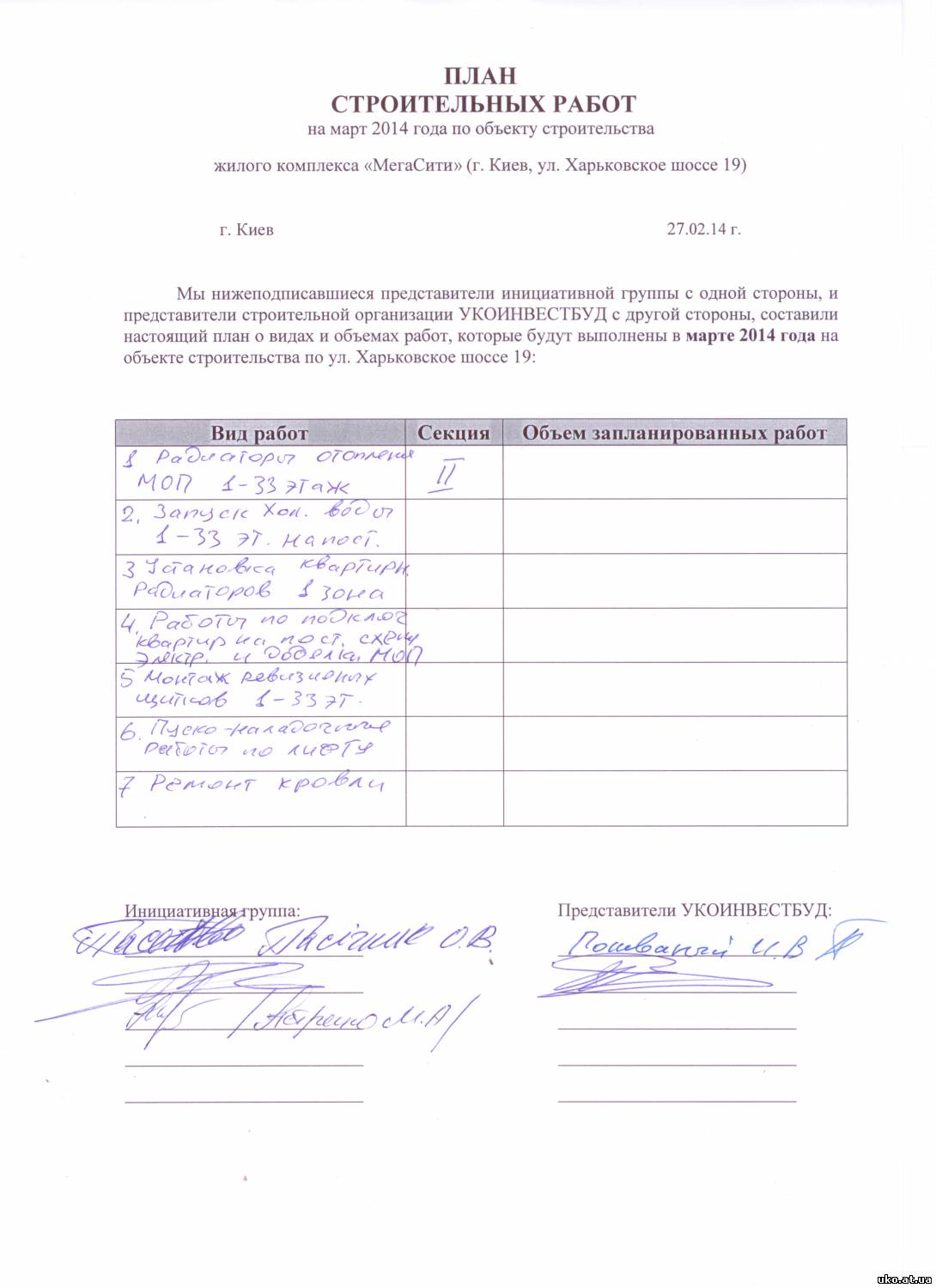 Уважаемый Виктор Федорович (Николай Янович, Александр Павлович)! Пользуясь случаем, выражаем Вам свое уважение и сообщаем, что в связи с очередным переносом сроков по вводу в эксплуатацию дома, расположенного по адресу: город Киев, Харьковское шоссе 19 и 19а, ранее заявленным на 31 декабря 2011 года (строительство ведётся с 2005 года), а также почти полным прекращением строительных работ застройщиком (Укоінвестбудом) по данному объекту, мы, нижеподписавшиеся инвесторы этого объекта просим Вас, Янукович Виктор Федорович (Николай Янович Азаров, Попов Александр Павлович), вмешаться в деятельность компании Укогруп и помочь инвесторам данного объекта. Мы предлагаем следующее: 1. По программе о предоставлении материальной помощи недостроям со степенью готовности выше 75% организовать финансовую поддержку данному объекту. 2. Легализовать данный объект, если на нём при строительстве были допущены нарушения. 3. Чтобы не повторялась подобная ситуация в будущем – запретить продажу квартир в объектах незавершенного строительства. Так чтобы застройщик полностью сам отвечал за свои действия, а не перекладывал свои проблемы на инвесторов. В случаи, если наше обращение будет проигнорировано, мы обещаем организовать акции протеста с 8 июня по 1 июля 2012 года, т.е. во время проведения чемпионата Европы по футболу. Акции протеста будут направлены против затяжных строительных работ и постоянных переносов сроков ввода домов в эксплуатацию ХШ 19 и 19а. Наши квартиры должны быть достроены к этому времени. В случаи необходимости готовы к радикальным мерам, таким как перекрытие автомобильных дорог. Надеемся на взаимопонимание.
